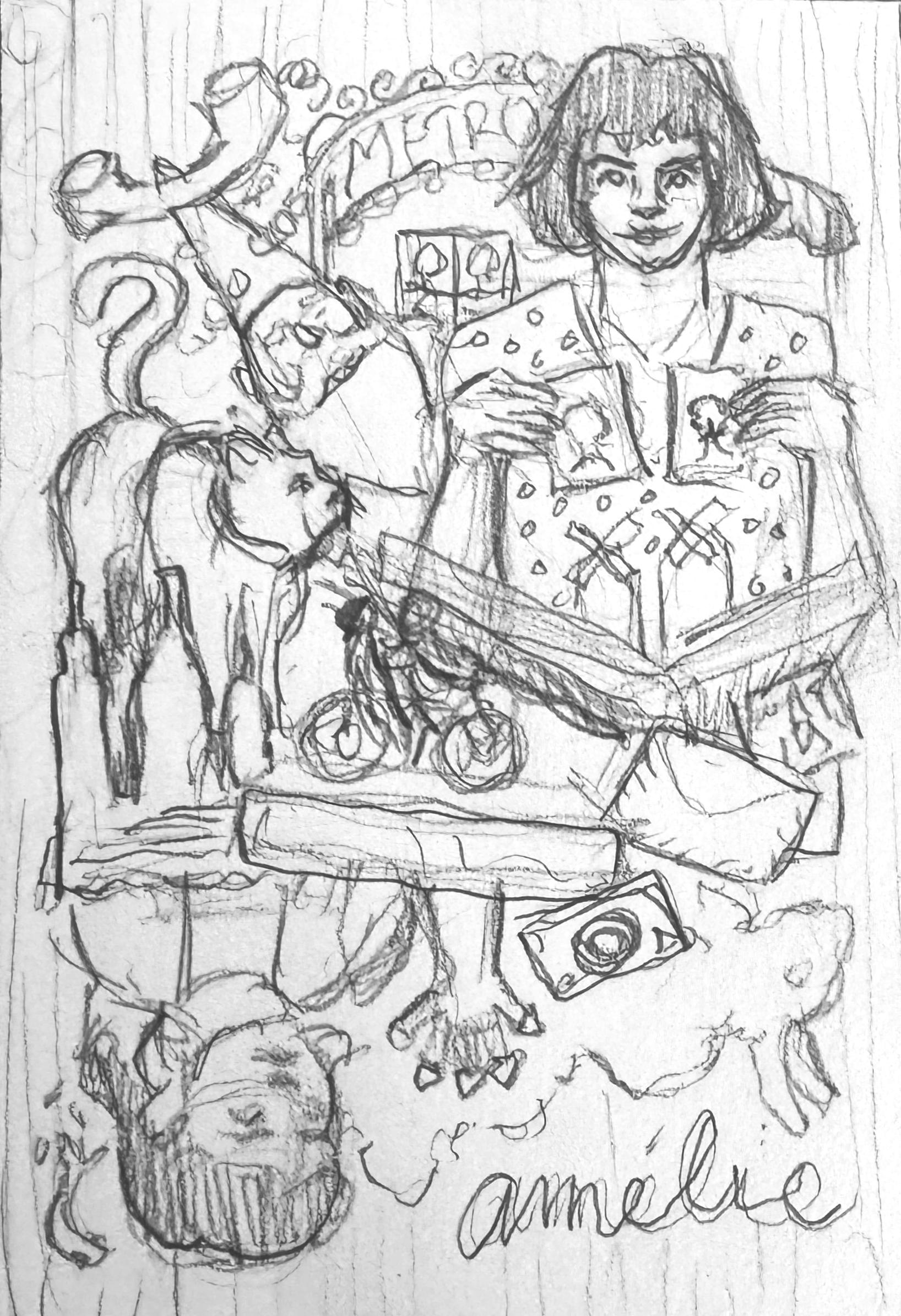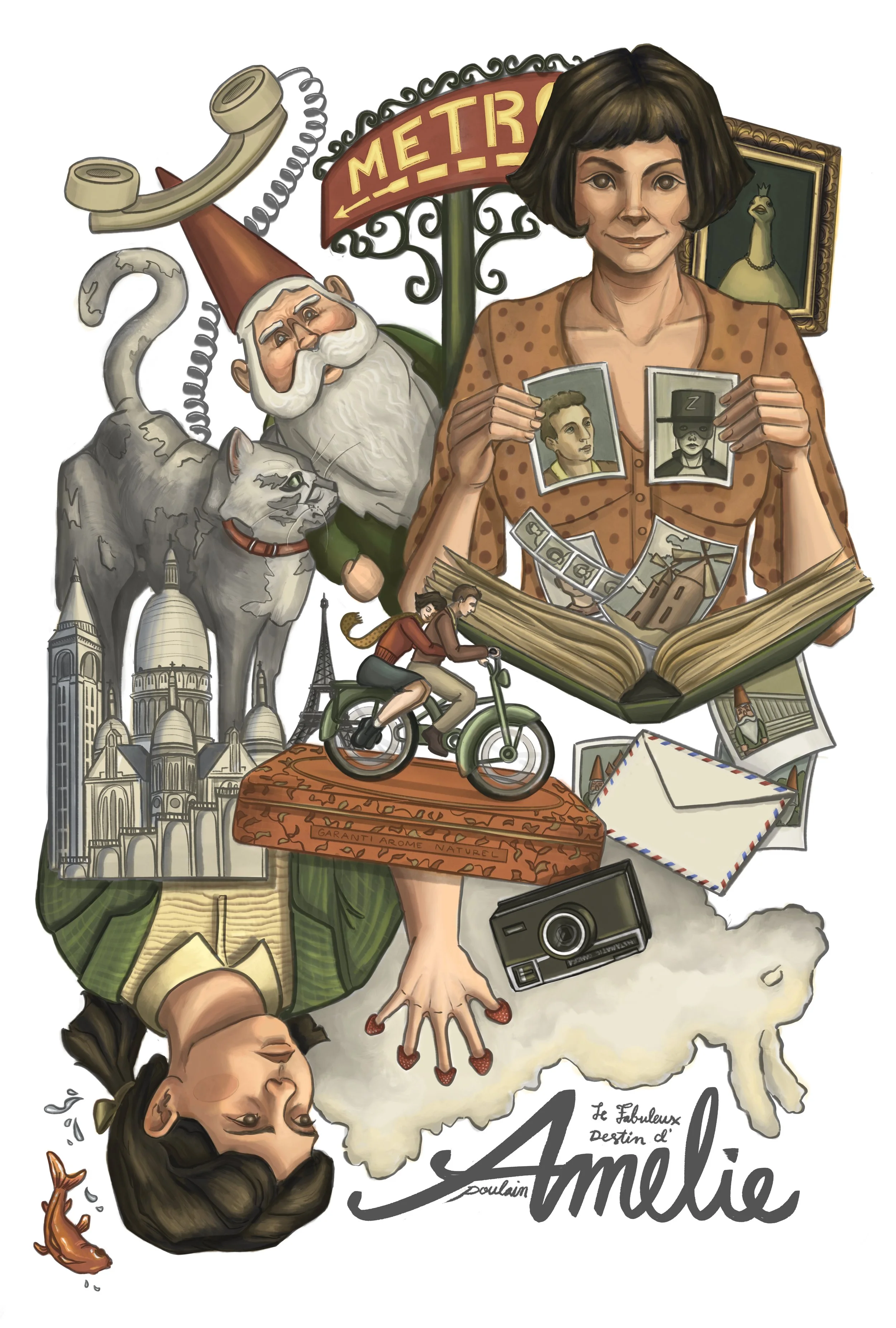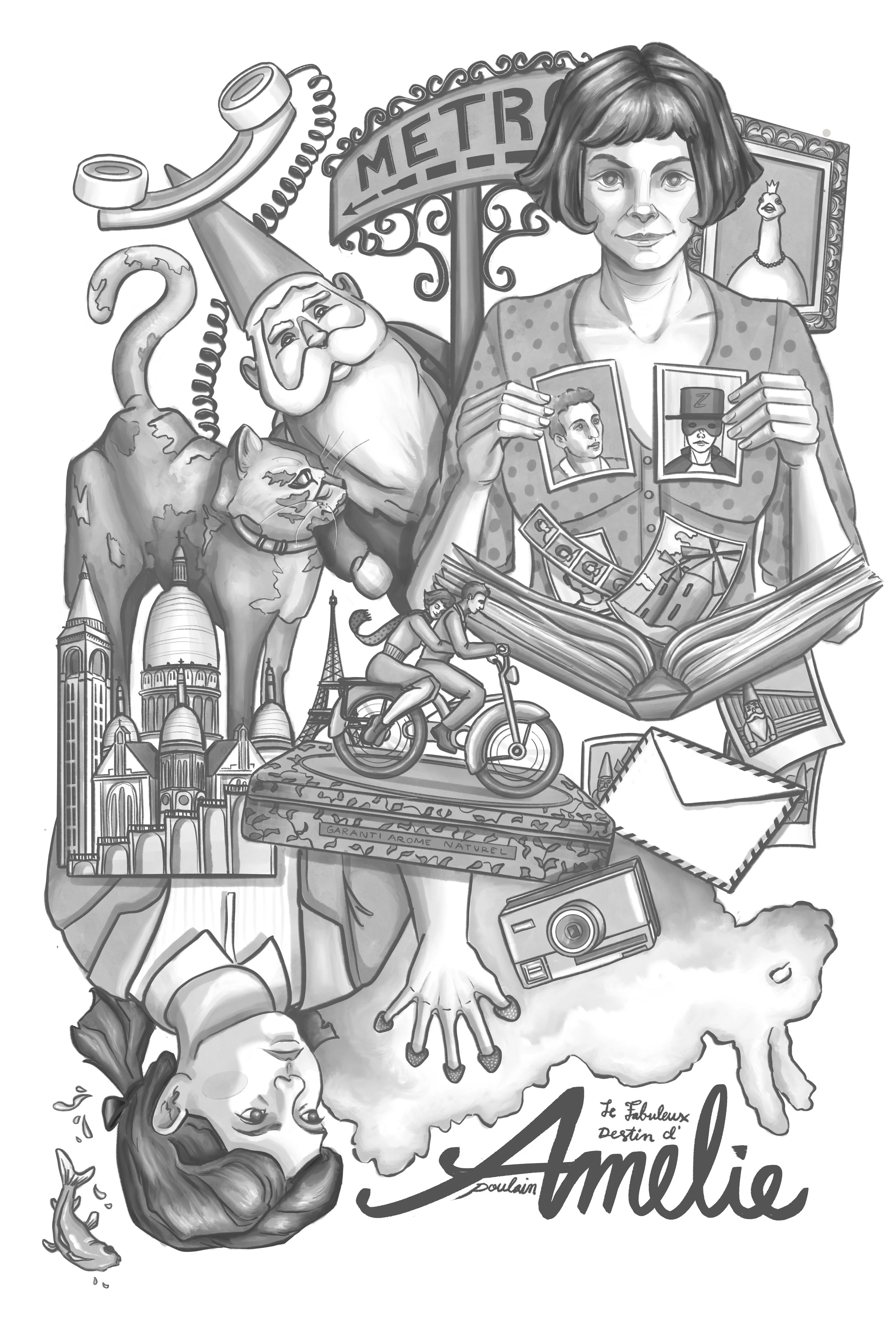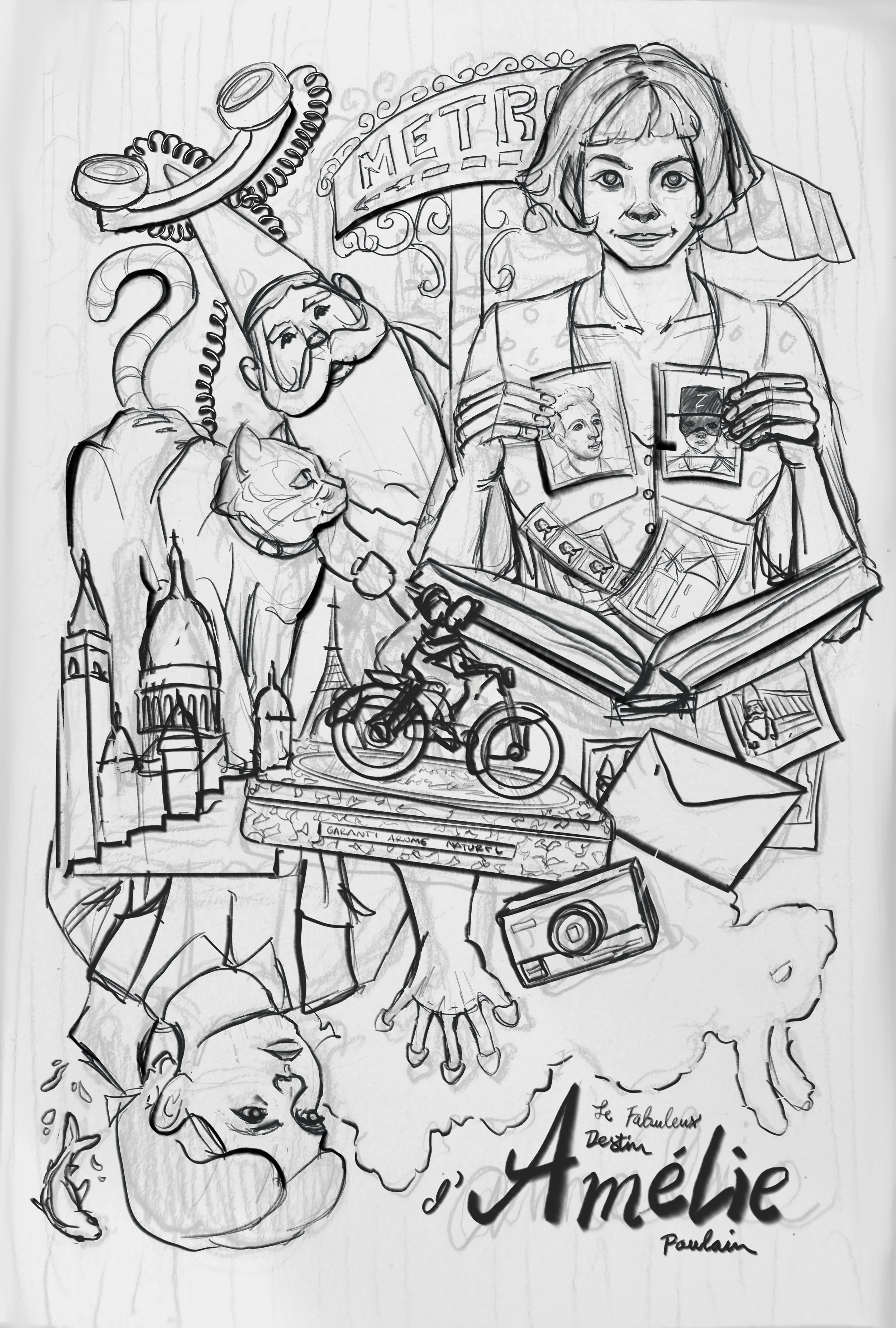 For the style of this alternate poster, I wanted to include a lot of the film’s quirky and seemingly random elements that are essential to its maximalist feel. This left me with a lot to organize into a pleasing composition. After a lot of thumbnailing, I settled on one that mirrors Amélie’s younger self and adult self. I sketched the rough drawing digitally, directly over the thumbnail, so that I would have more control over the placement.